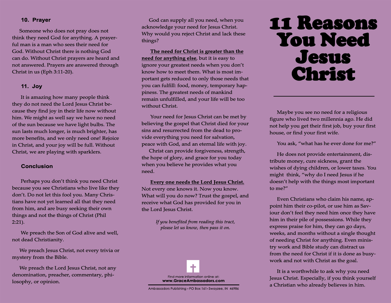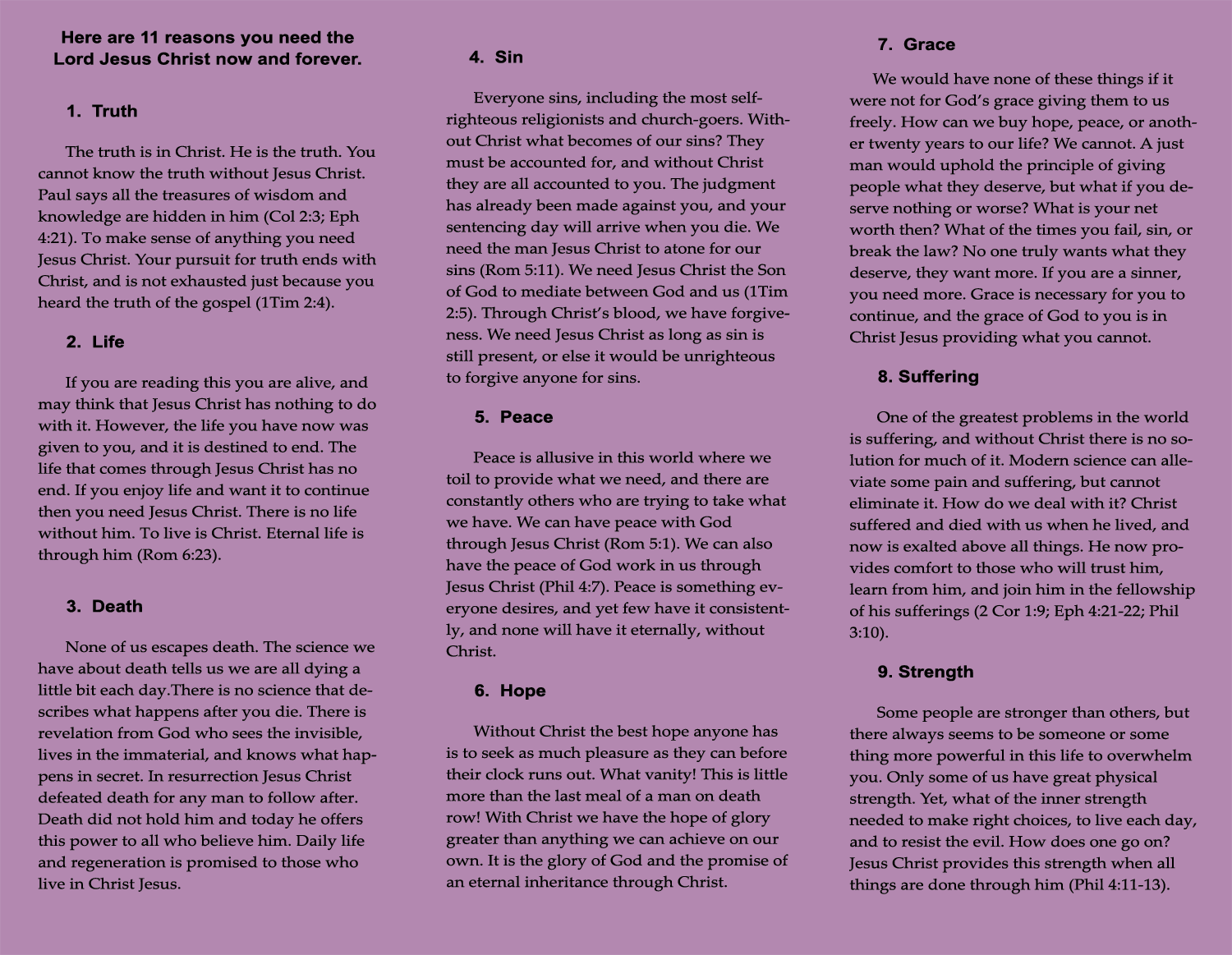 This trifold brochure is great for going door-to-door, fairs, booths, or to start a conversation with someone about the gospel or the Bible rightly divided. It is printed on brightly colored paper so that it gets noticed from a distance. Colors may vary. Text of the tract is found in the download link below.