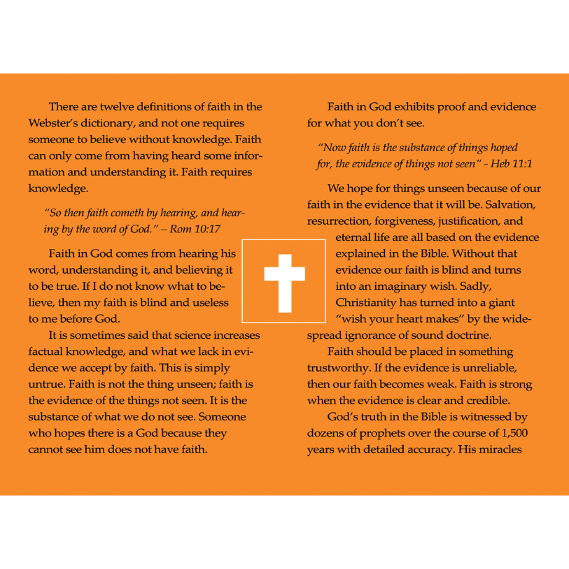 This hand-sized tract is great for going door-to-door, fairs, booths, or to start a conversation with someone about the gospel or the Bible rightly divided. It is printed on brightly colored paper so that they get noticed from a distance. Colors may vary. The text of the tract is found in the download link below.