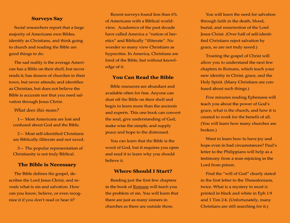 This trifold brochure is great for going door-to-door, fairs, booths, or to start a conversation with someone about the gospel or the Bible rightly divided. It is printed on brightly colored paper to get noticed from a distance. Colors may vary. Text of the tract is found in the download link below.