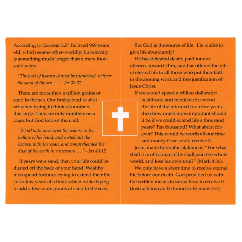 This hand-sized tract is great for going door-to-door, fairs, booths, or to start a conversation with someone about the gospel or the Bible rightly divided. It is printed on brightly colored paper so that they get noticed from a distance. Colors may vary. Text of the tract is found in the download link below.