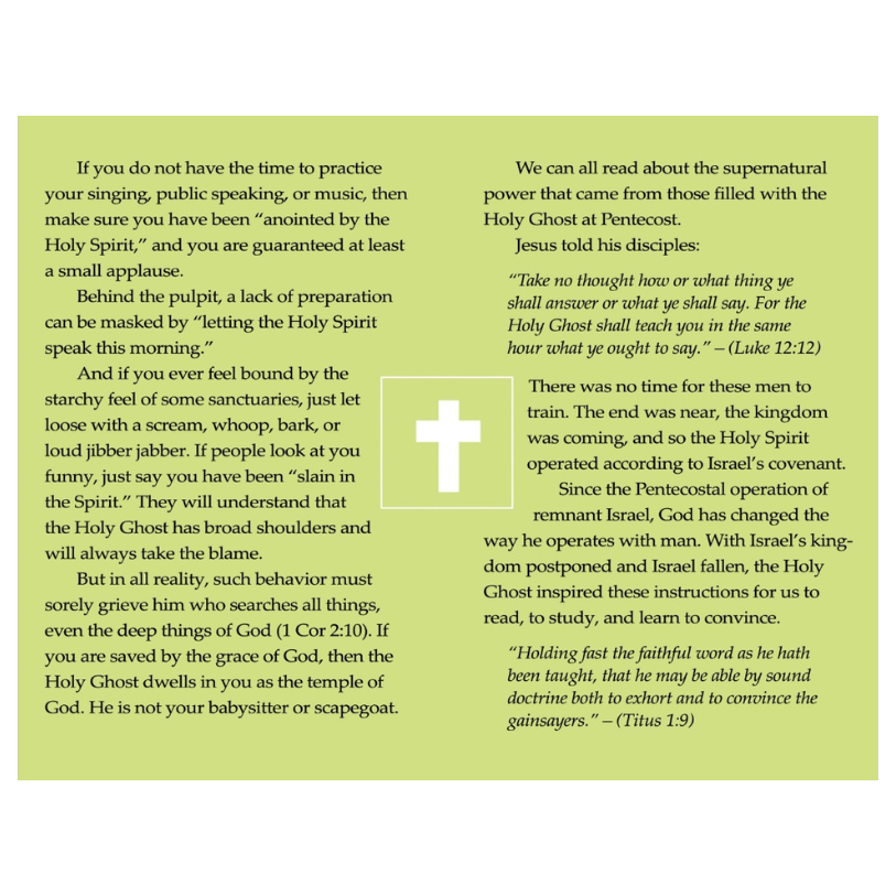 This hand size tract is great for going door-to-door, fairs, booths, or to start a conversation with someone about the gospel or the Bible rightly divided. It is printed on brightly colored paper so that they get noticed from a distance. Colors may vary. Text of the tract is found in the download link below.